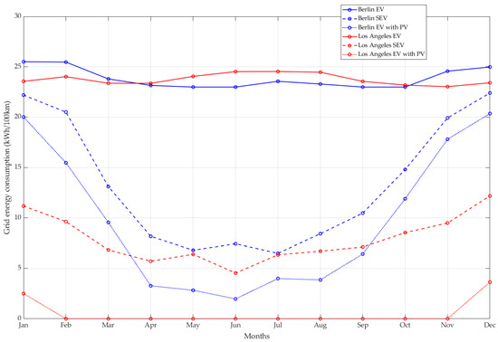 Figure 4 shows the monthly average energy consumption per 100 km for the three cases under study. In Case 1, the difference in consumption presents a slight difference which is mainly associated with weather conditions. From November until March, consumption is slightly lower in Los Angeles where higher solar irradiance is available and higher temperature values lead to lower heating load. During the rest months, the consumption is a few larger in Los Angeles due to the higher levels of temperature and therefore increased cooling load. Consumption per 100 km ranges from 23 kWh/100 km to 25.5 kWh/100 km in both cities. In Case 2, the lower deviation of Los Angeles solar irradiance throughout the year enables a high reduction of consumption for all months. An average monthly consumption of 7.9 kWh/100 km is achieved. On the contrary, in Berlin, during months with low available solar irradiance (from November until February) energy to recharge the EV battery mainly comes from the grid. Energy consumption ranges between 6.5 kWh/100 km in July and 22.4 kWh/100 km in December, with an average monthly value of 13.4 kWh/100 km. In Case 3, the PV installation fully covers the EV load in Los Angeles from February to November, resulting in zero consumption. The average monthly consumption is just 0.5 kWh/100 km. In Berlin, solar yield is mainly used during months with high irradiance, significantly reducing grid energy consumption during these periods. Minimum consumption reaches 2 kWh/100 km in June while the maximum value is 20.4 kWh/100 km in December. The average monthly consumption equals 9.8 kWh/100 km. Overall, the results are better for both cities compared to Case 2.
