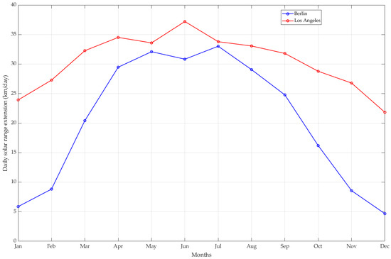 Figure 5 compares the daily solar range extension provided by the SEV relative to a non-solar EV in both cities. This metric does not apply to Case 3, as the requirement to park and charge the EV remains unchanged, making its range equivalent to Case 1. The results indicate that Los Angeles benefits from superior weather conditions for utilizing solar energy captured by PV panels. In Los Angeles, the daily solar range extension ranges from 22 to 37 km/day. In contrast, in Berlin, the range extension varies from just under 5 km/day in December to 33 km/day in July.