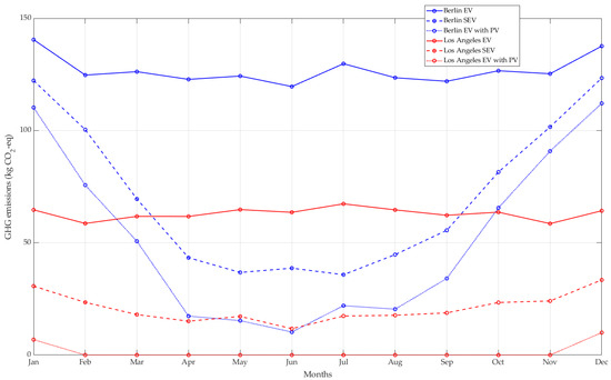 Figure 6 illustrates the monthly GHG emissions. In Berlin, utilizing an SEV significantly reduces GHG emissions, with even greater reductions when PV panels are used. This trend is also observed in Los Angeles, where emissions are generally lower than in Berlin throughout most months. Notably, in Case 3, emissions in Los Angeles are zero for ten months (February through November).