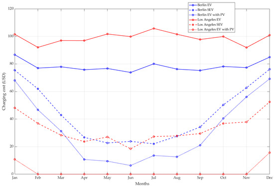 Figure 7 presents the monthly charging costs for all examined cases. Interestingly, while the charging cost for an EV in Los Angeles is significantly higher than in Berlin, using an SEV inverts this scenario, providing greater savings for users. Specifically, Case 3 is the most cost-effective for both cities, with zero charging costs for most months (February through November).