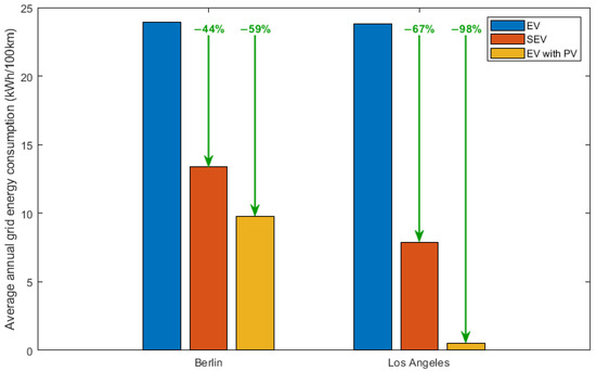 Average annual grid energy consumption per 100 km for the 3 examined cases in Berlin and Los Angeles.