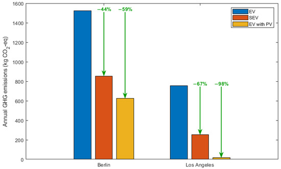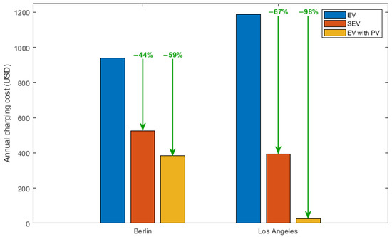 Figure 9 and Figure 10 present the annual GHG emissions and the annual charging costs, respectively. As anticipated, the reduction percentages align with the reductions observed in annual energy consumption. Notably, the use of an SEV in Berlin results in higher GHG emissions compared to an EV in Los Angeles (853.3 kg CO2-eq vs. 755.6 kg CO2-eq). This highlights a critical insight: improvements in EV energy efficiency alone cannot always compensate for the need for a low-GHG electricity mix. Conversely, regarding annual charging costs, cities like Los Angeles with higher electricity prices but similar weather conditions can benefit significantly from SEVs or PV-powered EV chargers. A 2 kWp PV system results in an annual charging cost of USD 26.5, while the same PV installation in Berlin leads to a charging cost of USD 385.5, which is comparable to the SEV charging cost in Los Angeles (USD 394.3).