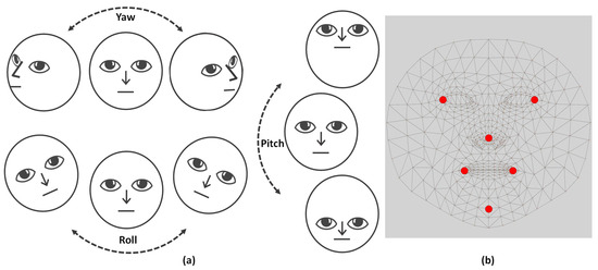 (a) Euler angles for head position estimation; (b) major facial landmarks for calculating Euler angles.
