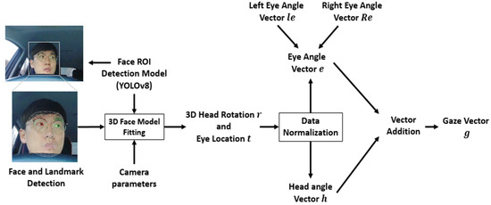 Gaze information extraction begins with detecting the facial region (Face ROI) from the input image using a YOLO model and identifying key landmark points. Next, a 3D face model is fitted based on the detected 2D facial landmarks, taking into account camera parameters to estimate the face’s position and orientation in 3D space. Through this 3D face model, the head’s 3D rotation (r) and the eyes’ 3D positions (t) are calculated. This extracted 3D information then undergoes a normalization process to ensure consistent results across various input conditions [28]. Based on the normalized data, the left eye angle vector (le), right eye angle vector (re), and head angle vector (h) are each derived. These calculated eye angle vectors (le, re) and head angle vectors (h) are then combined with consideration of their respective weights, reflecting the importance of each element in this process. Finally, as a result of this vector summation, a gaze vector (g) is generated, representing the driver’s gaze direction in 3D space. Figure 3 visually explains this process.