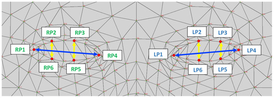 The determination of driver drowsiness is achieved by calculating PERCLOS using the eye coordinate values extracted in Step 1. PERCLOS is a representative indicator that can measure drowsiness, defined as the ratio of time when the eyes are more than 80% closed over a period of 3 min [29]. The equation for calculating the Eye Aspect Ratio (EAR) is as follows, and the key points used are the 12 coordinate values for the left (LP1~6) and right (RP1~6) eyes, shown as red dots in Figure 4. In the figure, yellow arrows indicate the vertical distances between the upper and lower eyelids, while blue arrows represent the horizontal distance between the outer and inner corners of each eye. These vertical and horizontal distances are used to calculate the EAR through the formula below.
