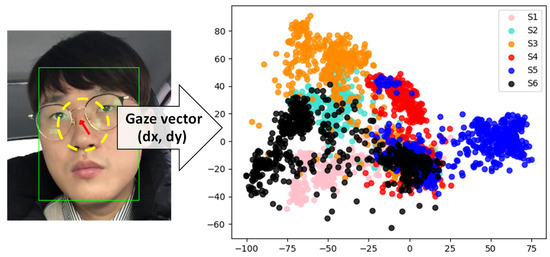 Figure 6 visually represents the single gaze vector values from Table 6 on the x and y axes, illustrating the characteristics of the collected driver gaze data. In the left image, the red arrows indicate the gaze vector (dx, dy). These arrows represent the direction and magnitude of the driver’s gaze. The right image shows the gaze movements for six scenarios (S1 through S6) depicted as a color-coded scatter plot. Each point in the scatter plot corresponds to a gaze vector, with its position indicating the horizontal (x) and vertical (y) components of the driver’s gaze direction.