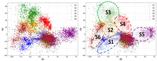 The image presented in Figure 7 illustrates the distribution of gaze vector components (dx, dy) for six distinct driver behavior scenarios, each represented by a different color. This visualization provides compelling evidence for the differentiation of driver attention states based on eye movement patterns. The scenarios are labeled as S1 through S6, where S1 represents the driver looking at the rear-view mirror, S2 indicates the driver focusing on the instrument cluster, S3 shows the driver’s gaze directed at the center console, S4 depicts the driver looking at the steering wheel, S5 signifies the driver observing the left side mirror, and S6 represents the driver checking the right side mirror. The right panel of the figure highlights these distinct clusters, demonstrating how each scenario results in a unique pattern of eye movements and gaze directions.