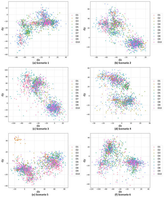 The clear clustering of data points corresponding to each scenario demonstrates that driver gaze patterns exhibit characteristic signatures depending on the specific driving-related task or attention state. For instance, scenario S3 (shown in green) appears to involve more upward and rightward gaze movements, possibly corresponding to checking the gear shift or center console. In contrast, scenarios S5 and S6 show concentrations of gaze vectors on the left and right sides of the central gaze point, respectively. This distribution likely indicates behaviors such as checking side mirrors or looking at the vehicle’s periphery, suggesting the driver’s attention to the lateral surroundings of the vehicle.