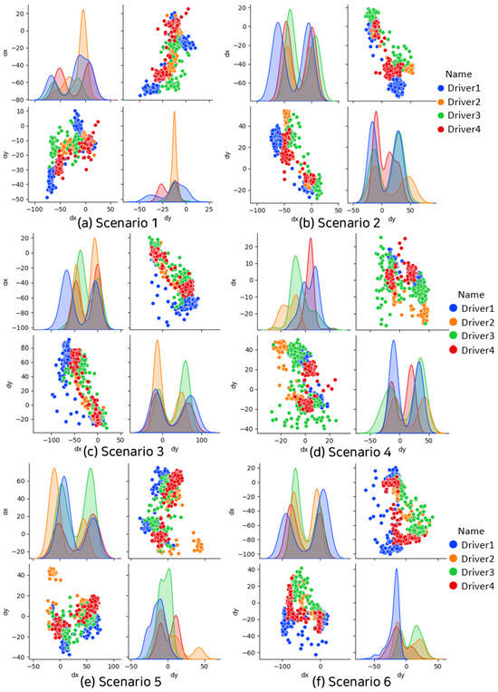 Figure 9 provides a comprehensive visualization of the correlation distribution between dx and dy coordinate values, representing gaze movement vectors for four drivers across six driving behavior scenarios. The figure consists of graphs showing dx and dy scatter plots for each driver, along with individual kernel density estimation (KDE) curves for dx and dy. These KDE curves, displayed on the sides of each scatter plot, illustrate the distinct density patterns of gaze movements along the x and y axes respectively. The varying shapes and peaks of these curves reveal unique concentration patterns of gaze for each scenario and driver. By analyzing these distinct patterns, it becomes possible to characterize and differentiate the gaze behaviors associated with each driving scenario. Each driver is distinguished by a unique color in both the scatter plots and the corresponding KDE curves, allowing for easy comparison across individuals and scenarios.