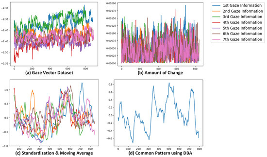 The final preprocessing step involves extracting common patterns using techniques such as Dynamic Behavior Analysis (DBA). Figure 10d presents a derived common pattern that represents characteristic behavior shared across multiple sequences. This pattern serves as a template for classification and further analysis.