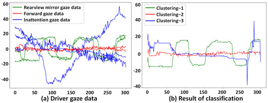 The CDIDM finalizes time series data on the rate of change in gaze vectors. When these data are classified using the K-means clustering model, they are effectively divided into three distinct categories. Figure 11 shows the results of classifying gaze data through the CDIDM. The data on the right show a total of seven sets of gaze data to be classified, consisting of two sets of gaze data from scenario 5, two sets of forward gaze data, and three sets of other gaze movement data. The graph on the left shows the results of the seven analyzed data classified into three time series consisting of driving-related gaze data, forward gaze data, and driver inattention data.