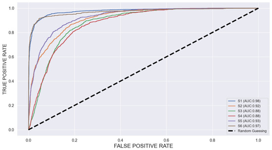 The AUC values for scenarios such as checking the vehicle infotainment system (S2), operating the center console (S3), and checking the instrument panel (S4) are 0.92, 0.88, and 0.88, respectively, showing relatively lower accuracy compared to the other scenarios. This lower accuracy is attributed to the complexity of the classification process due to the proximity of the related locations. Furthermore, there are still limitations in accurately recognizing gaze positions due to the low resolution of 480 p. However, when the gaze information is dichotomized into non-driving-related and driving-focused categories, we confirm that the accuracy improves to 97%.