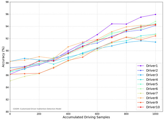 To demonstrate the effectiveness of CDIDM’s continuous learning capability, we conducted a longitudinal study using a subset of participant data. Figure 13 illustrates the improvement in accuracy as the system accumulates data from individual drivers.