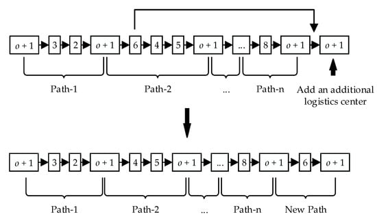 Based on this idea, by appending the logistics center site at the end of the route and transferring sites, the algorithm can search for potentially cost-reducing paths. The practical steps are as follows: