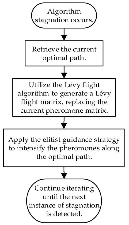 The pheromone matrix following the implementation of the elitist guidance strategy is illustrated in Equation (21). Here, τLévy represents the pheromones generated through Lévy flights, and N0 is the intensification multiplier. After the creation of the Lévy flight matrix, the elitist guidance strategy is applied in conjunction with the historically optimal paths. The core idea of this strategy is to enhance the pheromone concentration on portions of known good solutions, thereby making subsequent ants more inclined to choose these routes. The complete flowchart for the Lévy flight and elitist guidance segment is shown in Figure 3.