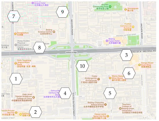 The simulation setting is orchestrated around a logistics hub situated in the Chaoyang District of Beijing, incorporating nine distribution nodes and one central logistics facility, sequentially numbered from one to ten. The intricacy of urban transportation infrastructure, featuring one-way streets, subterranean passages, and elevated roadways, engenders discrepancies in the bidirectional travel distances between these locations. This phenomenon bears a resemblance to the distance asymmetries characteristic of the asymmetric traveling salesman problem (ATSP), in which the travel expenditure from one point to another may differ from the cost in the opposing direction [27].