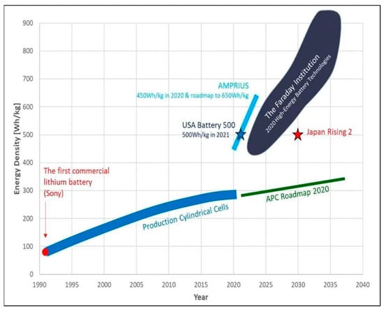 - Taylor, N. Cell Energy Density Roadmap. Battery Design, 6 January 2022. Available online: https://www.batterydesign.net/cell-energy-density-roadmaps/ (accessed on 24 July 2024).
