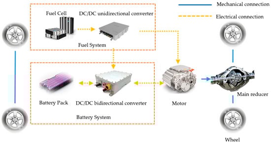This study focuses on a range-extended FCEV. The battery provides electric power to the motor through a bi-directional DC/DC converter, thereby driving the vehicle. The fuel cell recharges the battery via a unidirectional DC/DC converter, and the battery can also be recharged through regenerative braking from the motor. The power structure and key vehicle parameters are shown in Figure 1 and Table 1, respectively.