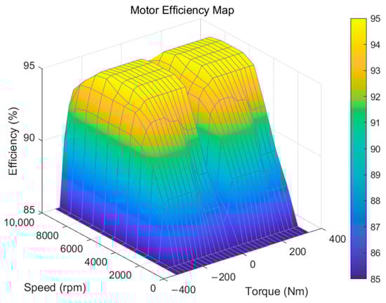 In Equation (2), is obtained from the motor map, which shows the relationship between efficiency, torque, and speed, as illustrated in Figure 2.