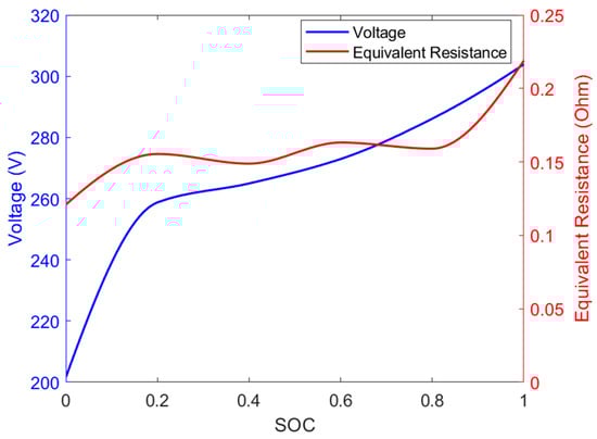 Relationship curves of open-circuit voltage and equivalent resistance with SOC.