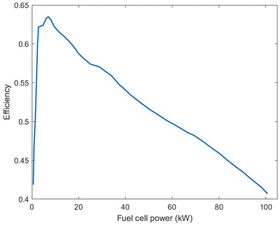 This paper primarily focuses on energy management issues, so the fuel cell model uses a look-up table method. The power–efficiency curve of the fuel cell is shown in Figure 4.