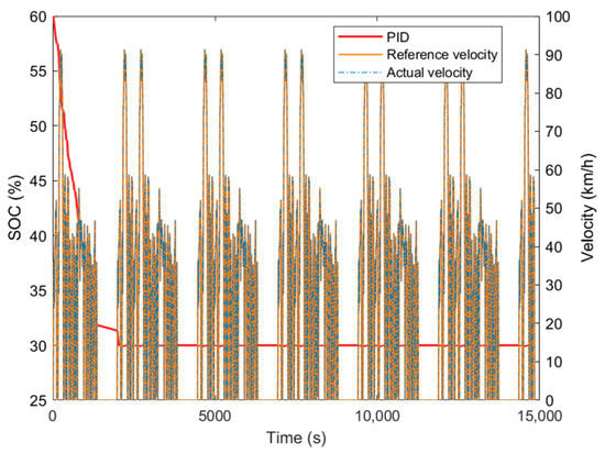 Under the PID control strategy, the FCEV operates in two modes: charge-depletion and charge-sustaining. In the charge-depletion phase (SOC > 30%), the vehicle’s energy mainly comes from the power battery, with the fuel cell at a low load or not operating. In the charge-sustaining phase (SOC ≤ 30%), the fuel cell starts working continuously to recharge the power battery. The PID controller dynamically adjusts the fuel cell’s output power based on the deviation between the current SOC and the target SOC, ensuring that the battery SOC is maintained around 30%.