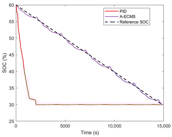 As shown in Figure 6, the SOC under the PID strategy decreases the fastest, especially rapidly in the early stage. This indicates that in the charge-depletion (CD) phase, the PID strategy primarily relies on the power battery’s energy for driving, and quickly transitions into the charge-sustaining (CS) phase later. The SOC stabilizes around 30% after the initial rapid decline, indicating that the fuel cell begins to take effect. Under A-ECMS, the SOC decreases more slowly and the curve is smoother, with the SOC value eventually approaching the target of 30%. This shows that A-ECMS maintains good energy management throughout the driving process, with a balanced energy distribution between the power battery and the fuel cell, making the SOC curve closely follow the reference SOC curve, thereby better maintaining battery health.