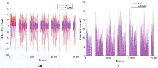 Key parameter changes under two strategies. (a) PID and A-ECMS power battery power; (b) PID and A-ECMS fuel cell power.