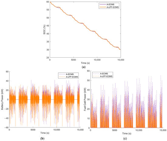 Comparison of key parameters between A-ECMS and A-LPF-ECMS. (a) SOC changes; (b) power battery power; (c) fuel cell power.