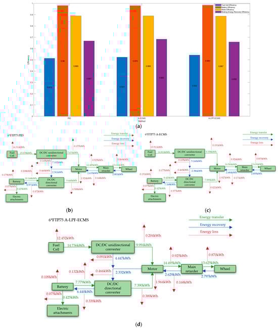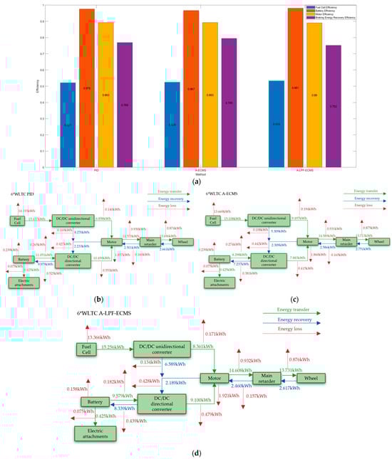 Efficiency of various components under 6*FTP75 Cycle. (a) Efficiency of key components under various strategies; (b) vehicle energy flow under PID strategy; (c) vehicle energy flow under A-ECMS; (d) vehicle energy flow under A-LPF-ECMS.