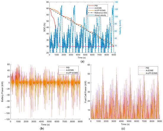Figure 11 and Table 6, it can be seen that A-LPF-ECMS performs excellently in terms of fuel cell efficiency, battery efficiency, and overall energy management. Specifically, the fuel cell efficiency of A-LPF-ECMS is the highest at 53.3%, compared to 52.1% for the PID strategy and 52.5% for A-ECMS. In terms of total energy consumption, A-LPF-ECMS has a total energy consumption of 30.705 kWh, whereas the PID strategy has 31.714 kWh and A-ECMS has 30.860 kWh. Regarding the energy loss ratio, A-LPF-ECMS achieves 62.919%, which is 1.428% lower than the PID strategy and 0.684% lower than A-ECMS. A-LPF-ECMS shows the least energy loss, demonstrating excellent energy-saving effects.