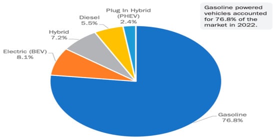 In order to ensure a clean climate and to account for the reduction of fossil fuels, internal combustion engines are being gradually replaced by electric drive systems in most life facilities. The technology of electric vehicles (EVs) is a suitable and efficient solution due to its reliability and sustainability. In 2020, the global electric car stock hit the 10 million mark, a 43% increase over 2019, and representing a 1% stock share. Battery electric vehicles (BEVs) accounted for two-thirds of new electric car registrations and two-thirds of the stock in 2020 [1,2,3]. Figure 1 illustrates the market share of EVs in comparison to the other fuel vehicles [3].
