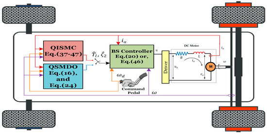 In this work, the problem of speed trajectory tracking control for EV DC drive systems subjected to unmatched load torque will be addressed and assessed based on disturbance-based backstepping control methodologies. Two backstepping control schemes are proposed, represented by a quasi-sliding mode disturbance observer-based backstepping controller (BS-QSMO), and backstepping based quasi-integral sliding mode control (BS-QISMC). The design and stability analysis are developed to ensure the ultimate boundedness of tracking and estimation convergence errors. In addition to the conventional backstepping control algorithm, the proposed controllers are compared in terms of tracking and estimation convergence errors. The main challenging task of these controllers is how to manage the unmatched disturbance in the framework of backstepping control. Figure 2 presents the schematic configuration of the proposed backstepping controller based on the two disturbance observers for an EV based on a DC drive control system. In this configuration, a one-motor drive with a differential is assumed. Nevertheless, a four-motor drive (one motor for each wheel) is a case that leads to what is called a quarterly traction EV. However, this study will be concerned with speed control of the driving motor of one motor drive with a differential configuration EV.