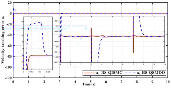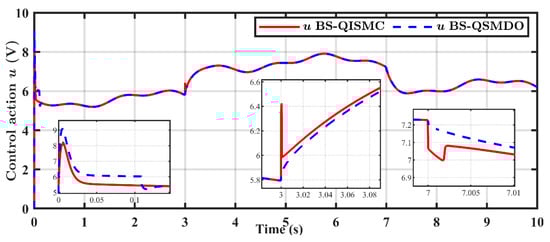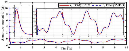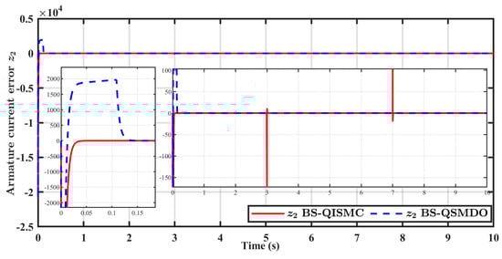 Figure 7 shows the responses of armature currents , represented by state variable , due to the proposed controllers. It is worth mentioning that the state tries to strictly follow the virtual controller, which in turn enables the state variable to track the desired speed. According to the figure, one can observe that the highest initial current can be produced by the BS-QSMDO controller, while the other controller gives lower initial values for armature current.