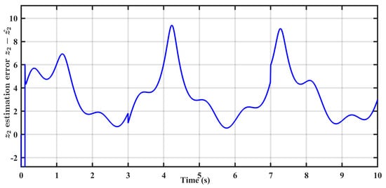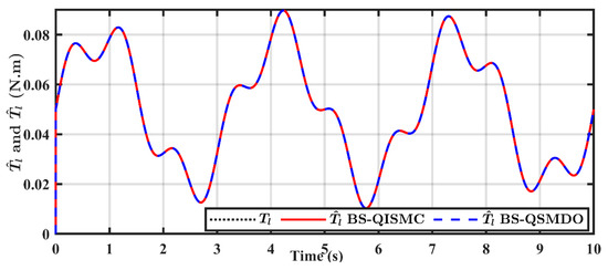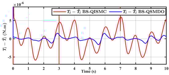 Figure 8 and Figure 9 show the state and error estimation errors based on QSMDO. The ultimate boundedness of the estimation error is obvious from the figures with a focus on the state due to considering the control problem relative to output tracking control. Figure 10 shows the actual load torque and its estimates resulting from QSMDO and QISMC. One can see that they are capable of estimating the load torque with considerably small errors. However, QSMDO shows the lowest disturbance estimation error. Figure 11 shows the estimation error between the actual load torque and its estimate . As previously proved in the stability analysis, it is clear that the ultimate bound can be reached by both of the proposed controllers. However, the ultimate bound produced by BS-QSMO is lower as compared to that of BS-QISMC, as shown by the RMS value of the estimation error in Table 2.
