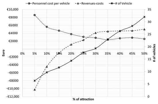If the attraction percentage increases to 20% (400 served passengers), 15 vehicles will be required, and the positive economic results will be about 1000 €/year. Greater attraction percentage increases positive results, but the difference between the revenues and costs trend seems to reach a plateau above 30%.
