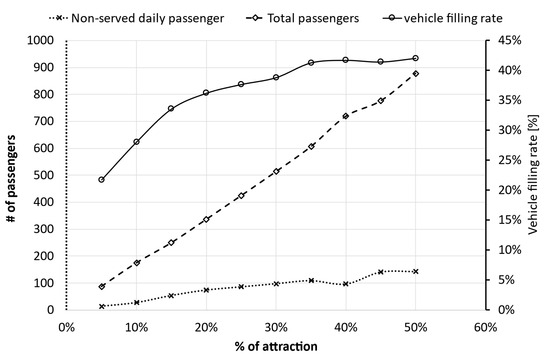 Simulation results by varying the attraction percentage in terms of vehicle filling rate and passengers.