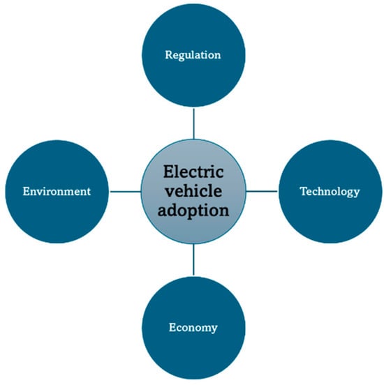 From the standpoint of the customer, the factors that encourage and inhibit the adoption of EVs can be divided into four categories: technological, social and cultural, economic, environmental [14], and regulation [31] (Figure 1). The technological factors include charging infrastructure, availability, and accessibility. They are essential enablers of EV adoption, highlighting the significance of comprehensive charging networks [32,33,34]. A critical technological consideration is the availability of robust charging infrastructure. A well-spread charging station network can reduce range concerns, making EVs more attractive and practical for customers [35,36]. The mileage of EVs is another essential element that affects the adoption of EVs. If potential consumers think an electric car has an adequate range to satisfy their driving demands without requiring regular recharging, they are more inclined to consider it seriously [37,38].