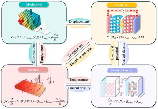 Understanding multiphysics processes is crucial for battery operations, as these involve intricate interactions among chemical, electrical, thermal, and mechanical phenomena, each influencing the others. Effective predictive modeling, performance evaluation, and design optimization rely on accurately capturing these simultaneous dynamics. Multiphysics battery modeling provides a framework to decode and quantify these complex interdependencies. This approach offers valuable insights into battery behavior, contributing to improved reliability and efficiency. The integration of these processes is detailed in the coupling scheme presented in Figure 3, highlighting the interconnected nature of battery systems and their operational challenges [69].