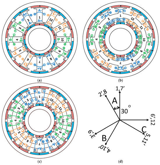 Cross sections of 12s10p machines and coil EMF phasors. (a) TC-SDRPM. (b) TC-PDRPM. (c) TW-PDRPM. (d) Coil EMF phasors.