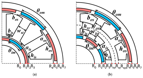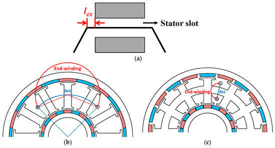 where y is the coil pitch, Ns is the number of stator slots, R3 and R4 are the stator inner and outer radii, respectively, his and hos are the stator inner and outer tooth–tip height, wst is the tooth width, and lex is the extend part, as shown in Figure 4a.