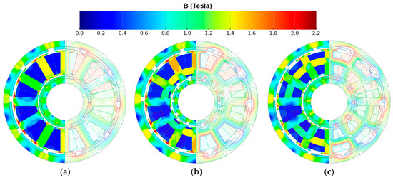 Open circuit flux density and equal potential distributions of optimised 12s10p machines. (a) TC-SDRPM. (b). TC-PDRPM. (c). TW-PDRPM.