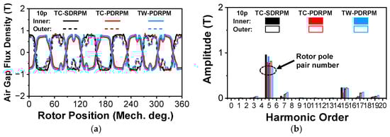 Inner and outer air gap flux densities of 12s10p machines. (a) Waveforms. (b) Spectra.