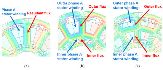 In the PDRPM machine (Figure 1b), the inner and outer PMs have opposing polarities of magnetic motive forces (MMF) in the inner and outer air gaps. To produce opposite polarities of the MMFs in different air gaps, the PDRPM machine uses either the toroidal winding (TW) or tooth coil (TC) configurations. The TW configuration allows stator coils to be wound on the common stator yoke directly [9,10,11]. In contrast, in the TC configuration, stator coils are wound on the inner and outer stator teeth in different directions [12], as shown in Figure 1b,c. The applications of TW- and TC-PDRPM machines to direct-drive wind power generators have been investigated in [13,14,15,16], where the active mass, stability, and PM usage of TW-PDRPM machines are analysed in [15], while the performance of TC-PDRPM machines with different slot/pole number combinations is analysed in [16]. In addition, the torque enhancement of both TW- and TC-PDRPM machines by using magnetic field modulation is investigated in [17].