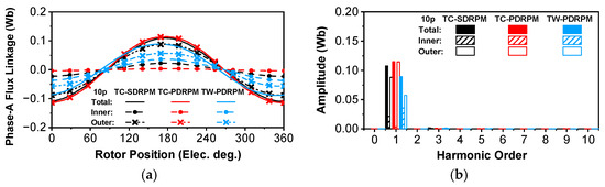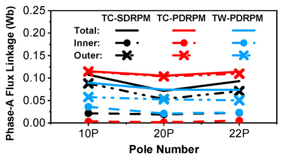Figure 17 shows the phase A flux linkages of all machines with different pole numbers. In TC-PDRPM machines with different pole numbers, the flux linkage generated by the inner rotor is negligible. However, the outer rotor radius is significantly larger than that of the inner rotor, and the outer PM generates higher flux due to the larger PM width. As a result, the outer rotor generates significantly higher flux linkage. Thus, TC-PDRPM machines with different slot/pole number combinations have the highest total flux linkages among all machines. The total flux linkages of the 10p and 22p TC-SDRPM machines are higher than those of the corresponding TW-PDRPM machines. The outer flux linkages of the 20p TW-PDRPM and TC-SDRPM machines are similar. However, the TC-SDRPM machine has a lower inner flux linkage compared to the TW-PDRPM machine. Therefore, the total flux linkage of the 20p TW-PDRPM machine is higher than that of the 20p TC-SDRPM machine. The back EMFs and flux linkages of all machines under different pole numbers with similar relationships are shown in Figure 18.