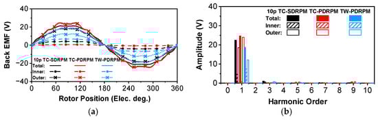 The TW configuration restricts the number of inner and outer stator winding turns in the PDRPM machine. As a result, the inner rotor of the TW-PDRPM machine produces the highest flux linkage compared to other machines. Conversely, the outer rotor of the TW-PDRPM machine generates the lowest flux linkage (Figure 8) due to the outer number of turns also being restricted by the TW configuration, which makes the total flux linkage of the TW-PDRPM machine the lowest. In the TC-SDRPM machine, the inner flux is detrimental to the outer flux, which lowers the total flux linkage of the TC-SDRPM machine compared to the TC-PDRPM machine. The back EMFs of optimised 12s10p machines have similar trends as the flux linkages, as shown in Figure 9.