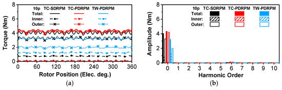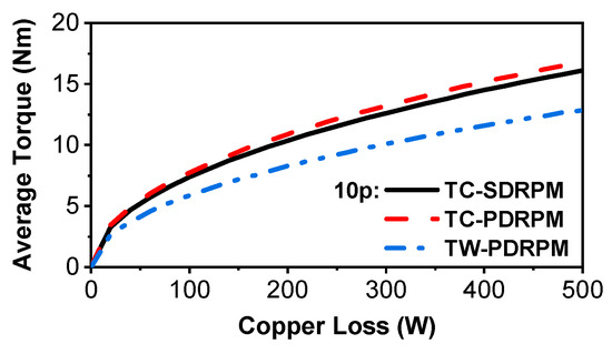 where ω is the machine rotating speed, and Ploss is the total loss in the machine. The performances of the 12s10p TC-SDRPM, TC-PDRPM, and TW-PDRPM machines are summarised in Table 4.