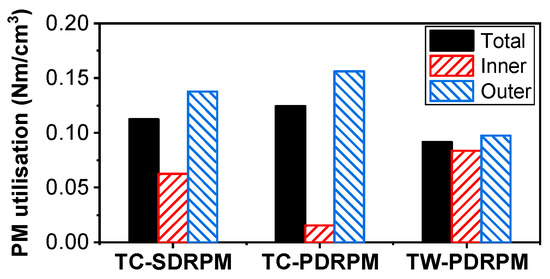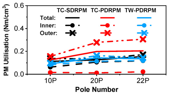 where Tavg is the average torque, and VPM is the PM volume. It can be seen that the TC-PDRPM machine has the highest outer PM utilisation, while the TW-PDRPM machine has the highest inner PM utilisation.