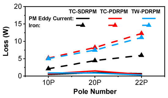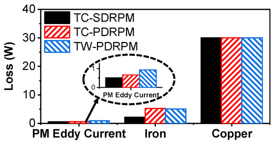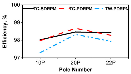 Furthermore, the efficiencies (5) of all three machines are calculated. The efficiencies of the TC-SDRPM, TC-PDRPM, and TW-PDRPM machines are 98.02%, 97.98%, and 97.29%, respectively. Clearly, the 12s10p TC-SDRPM machine has the highest efficiency due to the low PM eddy current and iron losses.