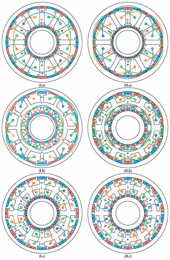 The influence of the slot/pole number combinations of TC-SDRPM, TC-PDRPM, and TW-PDRPM machines are investigated in this section, i.e., 12s10p FS machines, 12 slots 20 poles (12s20p), and 12 slots 22 poles (12s22p) IS machines. Their winding connections and corresponding coil EMF phasors are shown in Figure 14.